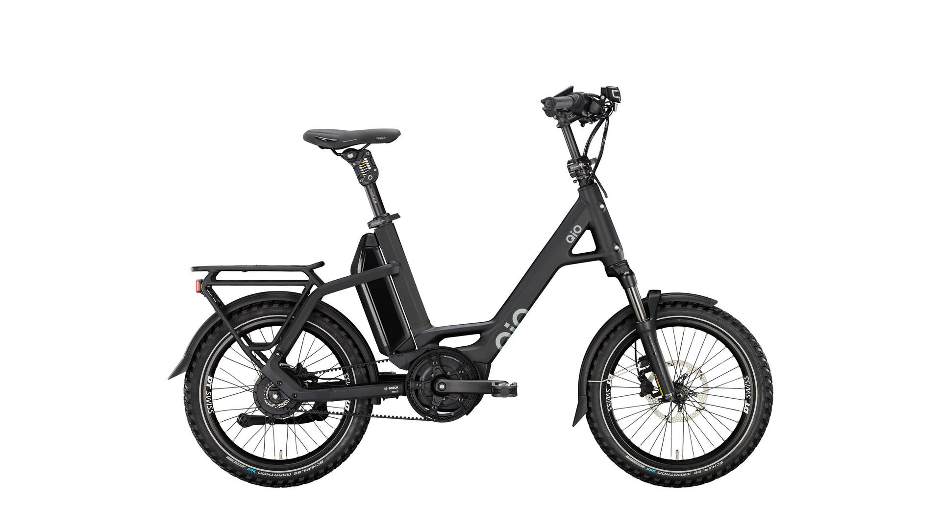 Il s'agit en premier lieu de la fourche suspendue et de la tige de selle suspendue. Le modèle Cross est le premier vélo électrique compact de la famille QiO à être doté d'un tel équipement. Cela t'offre plus de confort et un plus grand choix de possibilités de randonnées. A cela s'ajoutent les pneus Marathon increvables de Schwalbe ainsi que des freins à disque fiables - et c'est parti.